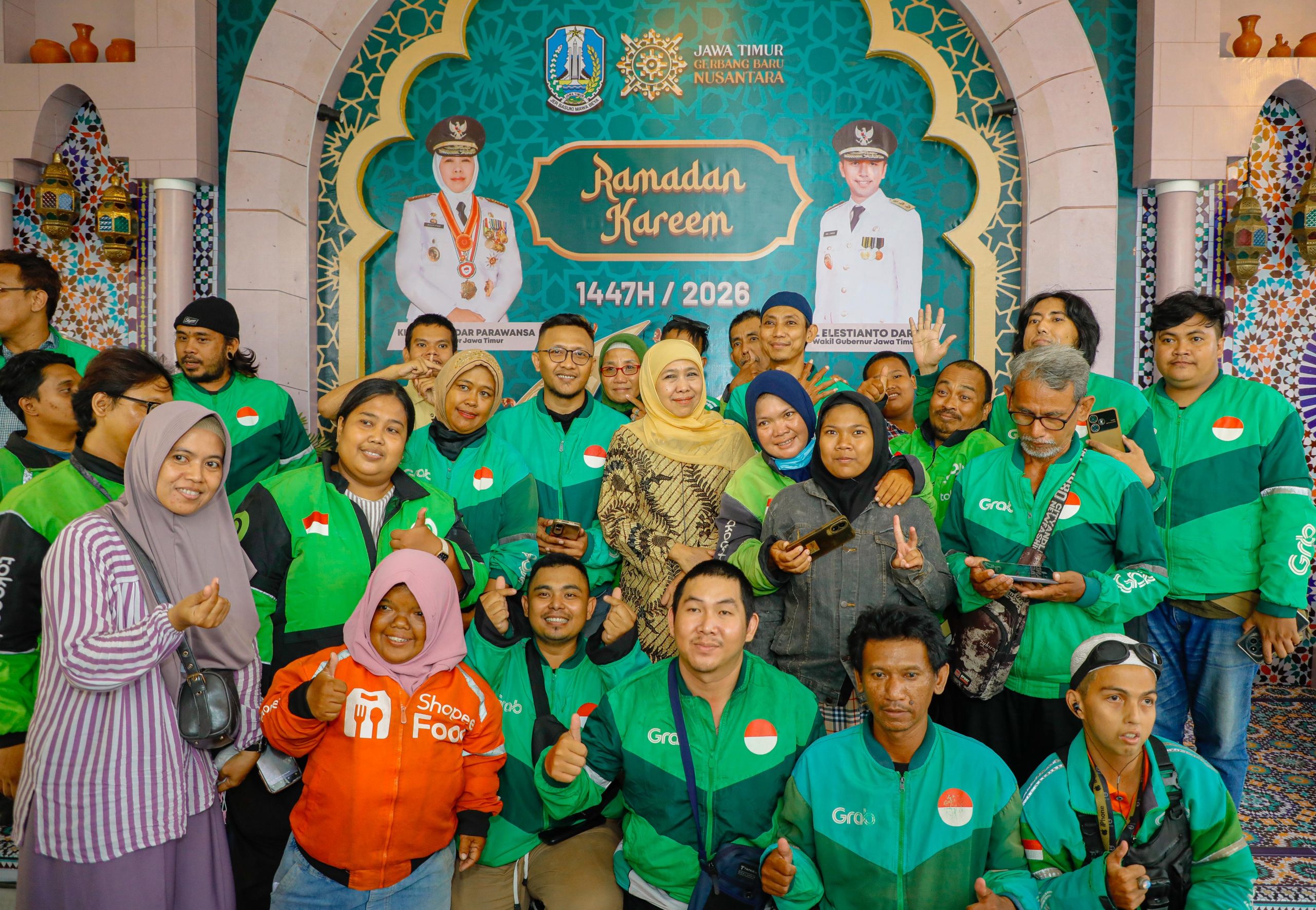 hariangresik.com | SURABAYA – Genap satu tahun kepemimpinan periode 2025–2030, Gubernur Jawa Timur Khofifah Indar Parawansa bersama Wakil Gubernur Emil Elestianto Dardak menyantuni anak yatim dan pengemudi ojek online (ojol) di Gedung Negara Grahadi, Surabaya, Jumat (20/2).